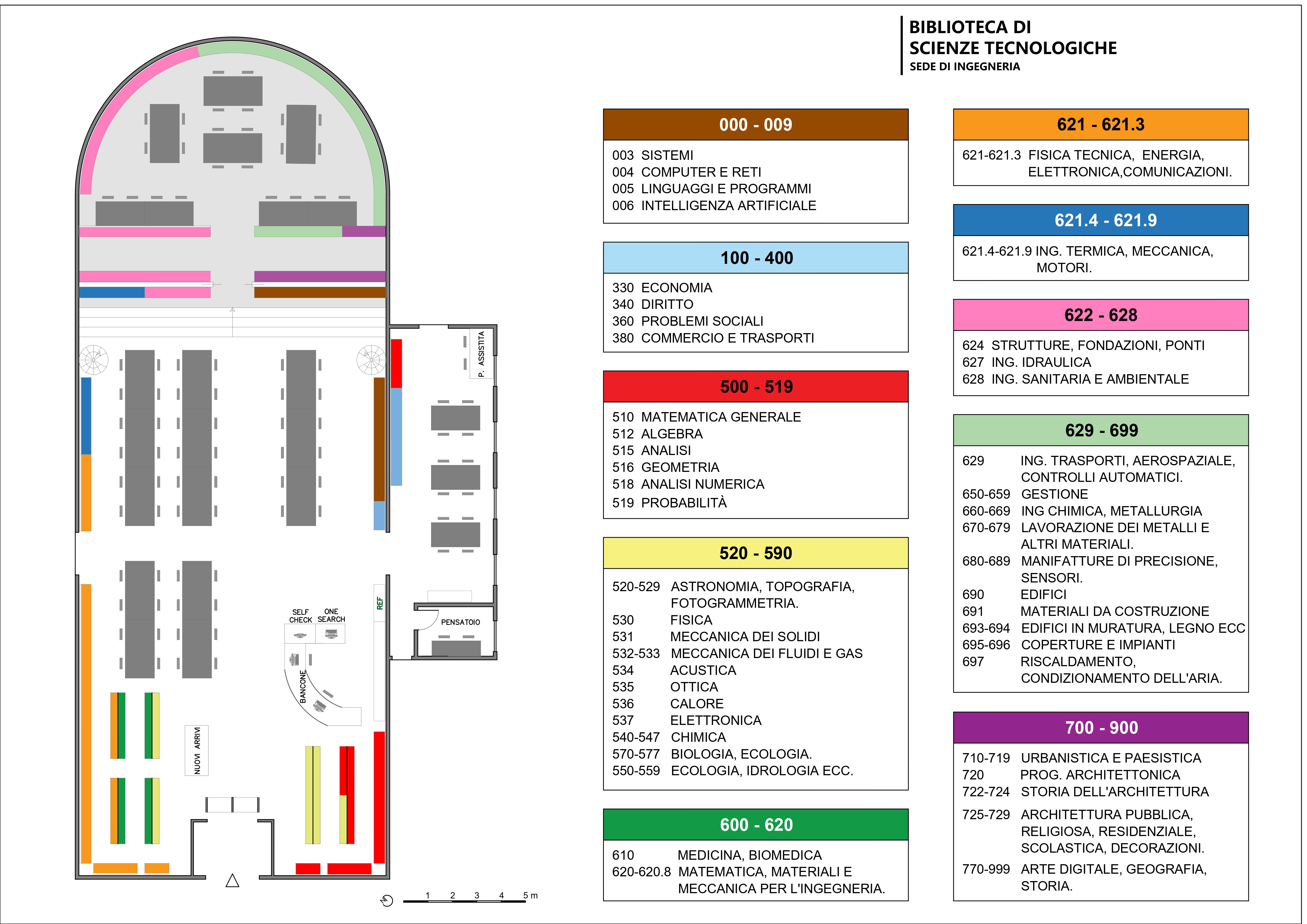 I documenti sono disposti per disciplina secondo la Classificazione decimale Dewey: le opere che trattano dello stesso argomento all'interno della stessa disciplina stanno quindi le une vicine alle altre.